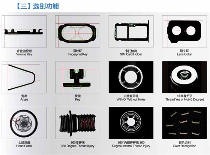 二、设备功能 也就是光学筛选机都能干嘛?检测些什么项目?一般检测项目从一个到二十几个不等。客户要求的尺寸、外观、颜色等都是可以检测的。那具体都可以检测那些呢?