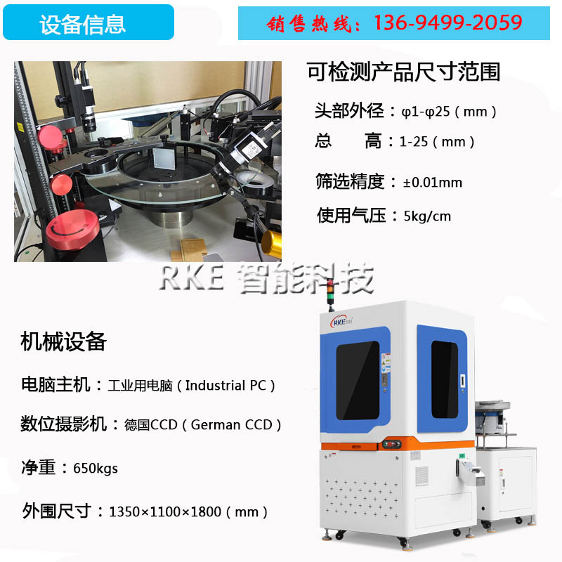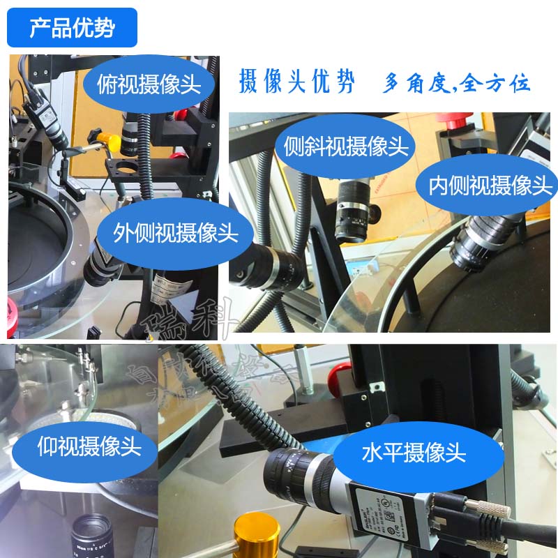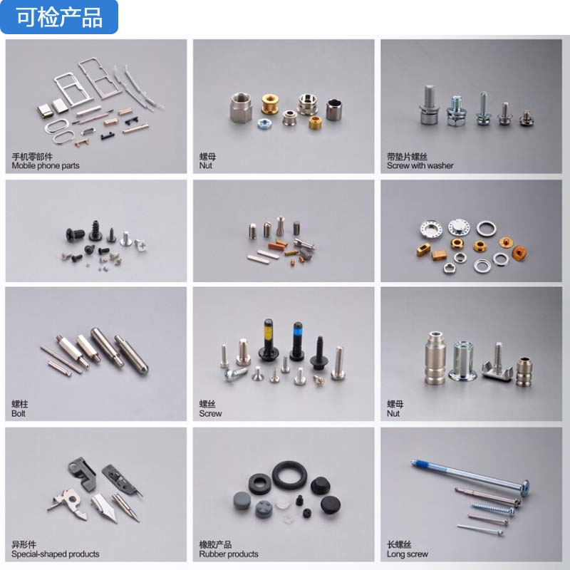 硬体配备包含振动送料机、下料轨道、检验平台、计算机系统為一安全、便利,且节省人力成本的自动化设备。分别介绍如下: