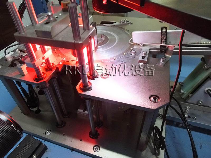 分度盘筛选设备检测五金螺丝,把在玻璃盘上站立不稳的物件,悬挂起来进行检测。检测范围广,速度快,精度高